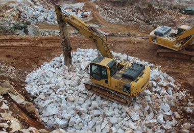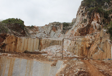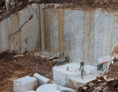 圖3結構完整的大理石礦,被工人在山上就地切成塊狀,運到山下通過圓盤鋸的切割,制成天然大理石板材。