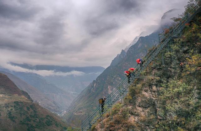 12月23日,滿頭大汗的懸崖村村支書某色吉日通過鋼梯把修民宿的樹脂瓦往村里背。