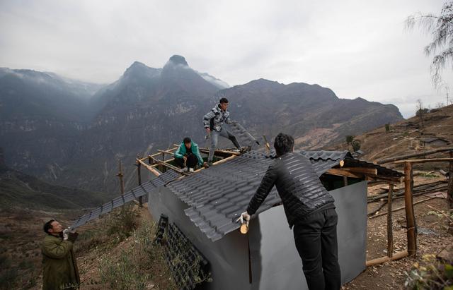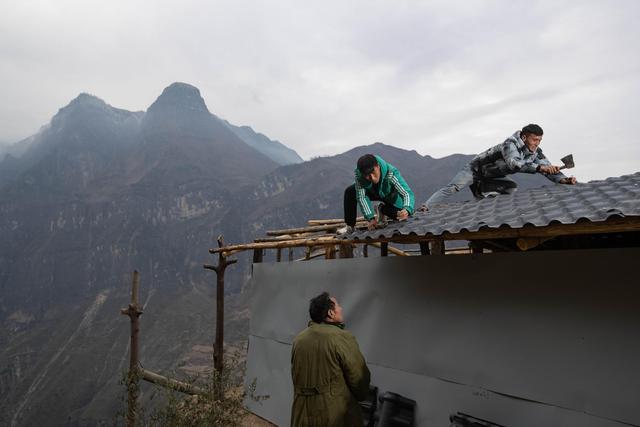 12月23日,某色蘇不惹(右)和同伴在懸崖村蓋樹脂瓦做的民宿。