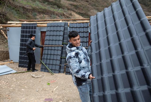 12月23日,某色蘇不惹(左)在捆綁固定合成樹脂瓦,準備通過鋼梯背到村里。