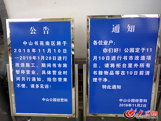 7日上午,大眾網記者來到位于中山公園內的中山書苑。在書苑北門,記者看到中山公園經營科的一則公告:中山書苑南區將于2018年11月10日至2019年1月28日進行改造施工。期間書市將暫停營業,具體營業時間另行通知。同時公園定于11月10日進行書市改造項目,請將柜臺里外所有書籍物品等在10日前清理干凈。
