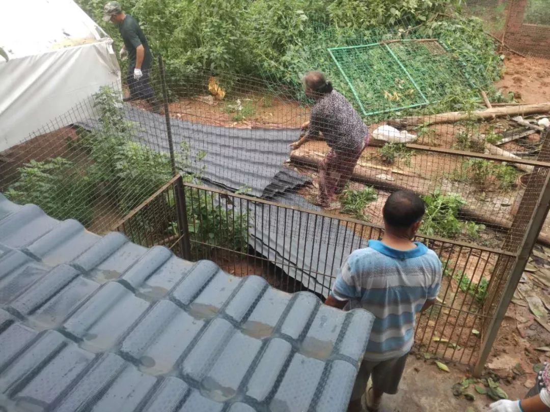 為了防止狗狗們跑掉,愛之家的所有工人們都冒雨出動,將后山圍了一圈鋼網。這些工人的年紀都在65歲以上,但他們干起活來,卻是一點也不含糊。鋼網并不是長久之計,圍墻還得再修,一切只能等到雨停了。